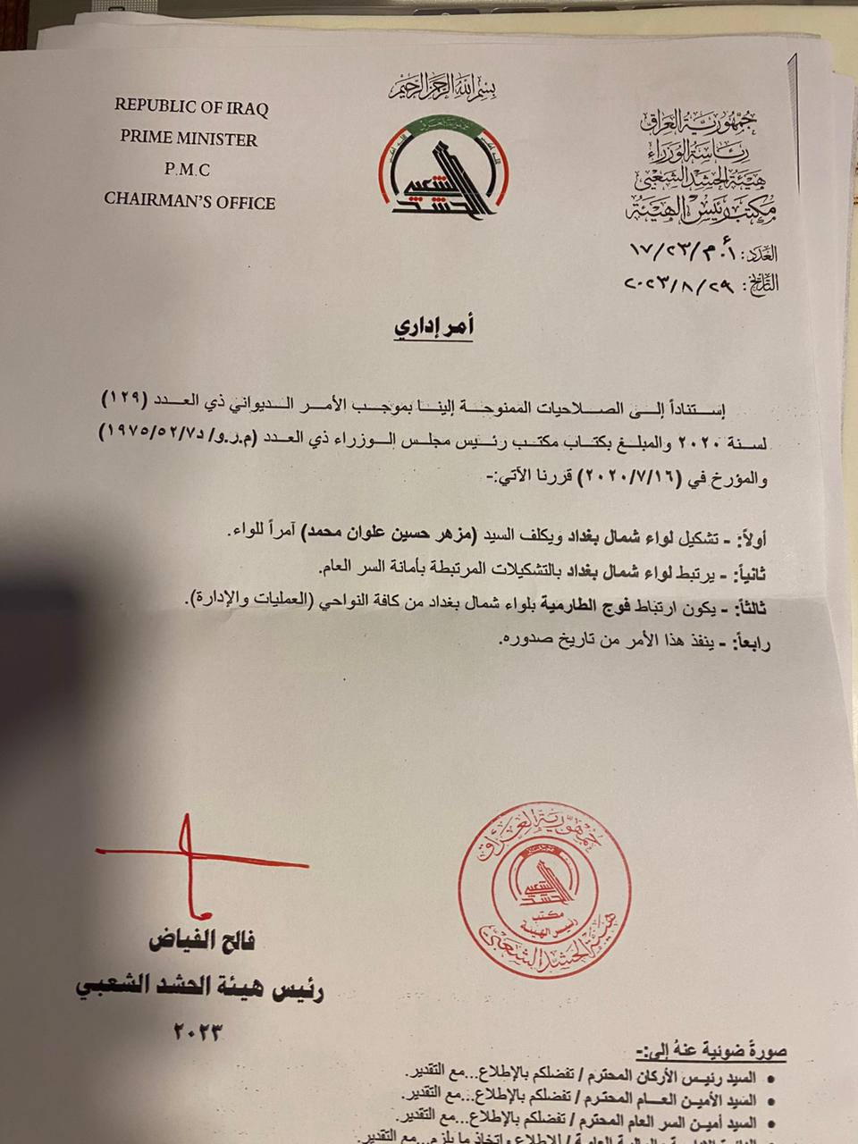 وثيقة رسمية صادرة عن مكتبه ومذيّلة بتوقيعه نصت على تكلف اللواء مزهر حسين علوان أمراً للواء الجديد مؤكدا أن لواء شمال بغداد يرتبط بالتشكيلات المرتبطة بأمانة السر العام، ويكون ارتباط فوج الطارمية باللواء المذكور من النواحي كافة العمليات والإدارة جدير بالذكر ان اعداد الحشد قد تجاوزت مئتين الف مسلح وفقاً لما أعلنه رئيس الهيئة معترفا ضمنيا بأن الفساد منتشر في جميع مفاصل الدولة ومن ضمنها الحشد والجيش.