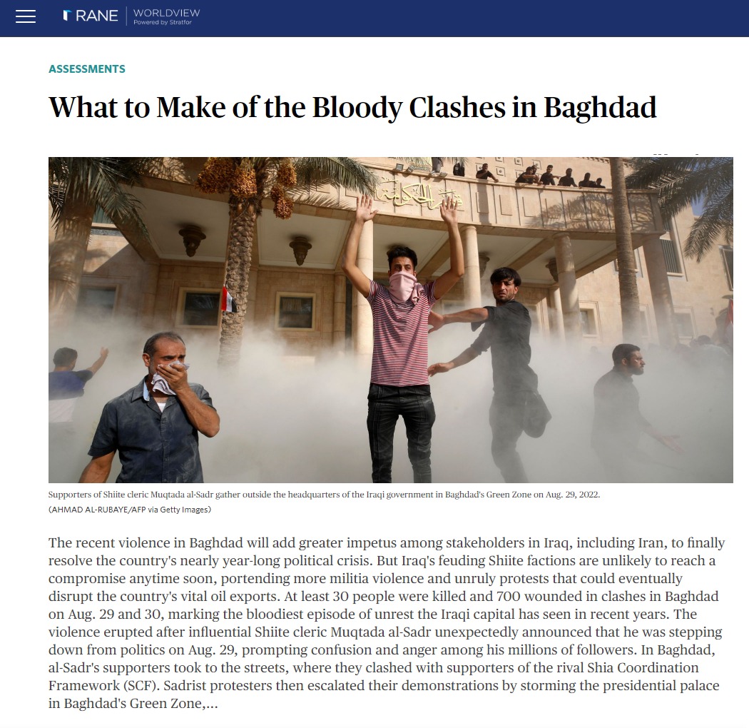 نشر معهد ستراتفور الأميركي تحليلا بعنوان “العراق سيشهد مزيدا من الاضطرابات” جاء فيه إن أعمال العنف الأخيرة في بغداد والبصرة تضع ضغوطا إضافية على المجتمع الدولي لإيجاد حل للأزمة السياسية المستمرة منذ ما يقرب من عام, بينما من غير المرجح أن تتوصل الفصائل الشيعية المتناحرة إلى حل وسط في أي وقت قريب، مما ينذر بمزيد من العنف والاحتجاجات التي قد تؤدي في النهاية إلى تعطيل صادرات النفط الحيوية للبلاد.