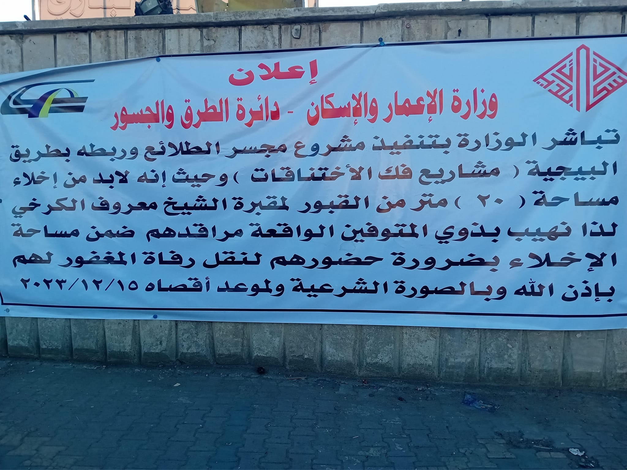 وزارة الإعمار والإسكان زعمت أنه لا بد من إزالة مساحة 20 مترًا من القبور في مقبرة معروف الكرخي للمباشرة بتنفيذ مشروع مجسر الطلائع وربطه بطريق البيجية.