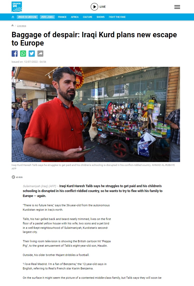 اودرت وكالة فرانس برس تقريرا بعنوان ” أمتعة اليأس .. موجة جديدة من هجرة الأكراد إلى أوروبا” قالت فيه إن طلاب أكراد عراقيين يكافحون من أجل التعلم والعمل في بلد يمزقه الصراع مبينة أن عددا كبيرا من الشباب مازالوا يبحثون عن الفرص للفرار مع عائلاتهم إلى أوروبا.
