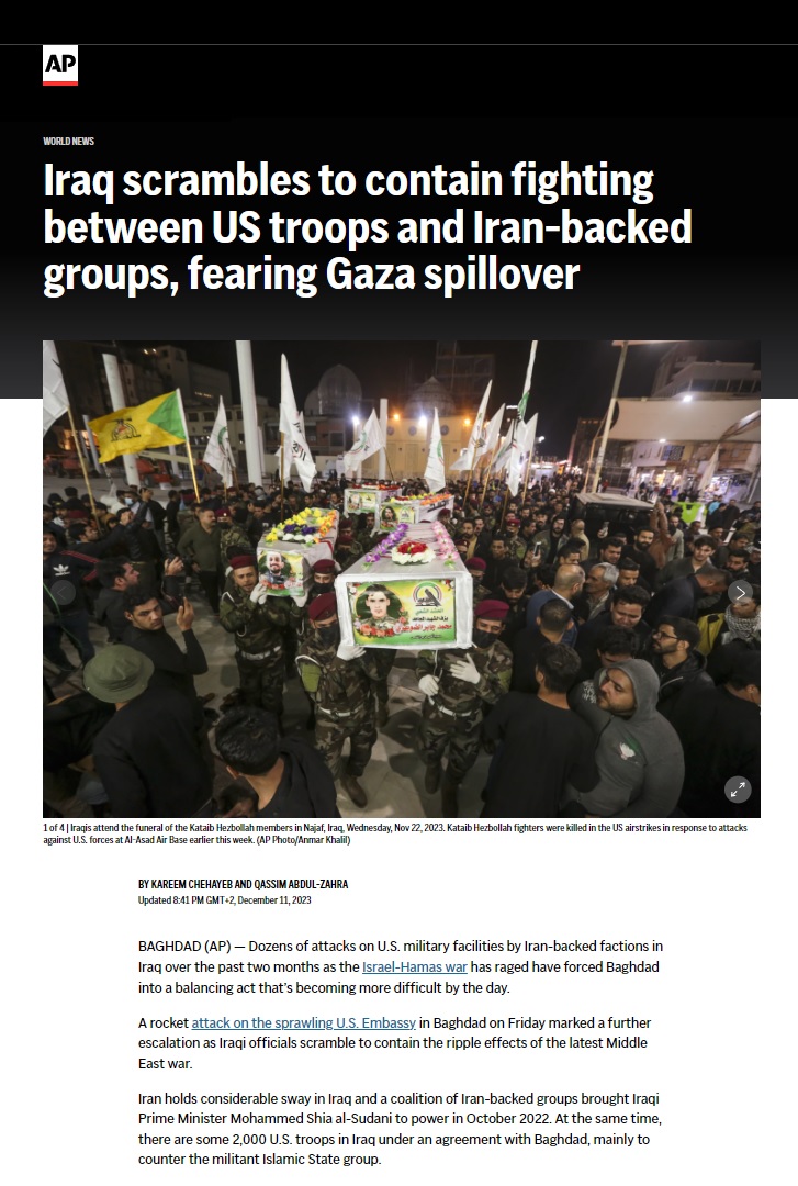 وأشار التقرير الأمريكي إلى ان تفاقم الحرب بين إسرائيل وحركة حماس أجبرت بغداد على التحرك بشكل متوازن وهو وضع يزداد صعوبة مع الوقت، مشيرة إلى أن سقوط صاروخ على مبنى السفارة الأمريكية يشكل تصعيدا إضافيا يحاول المسؤولون العراقية احتواءه لمنع تداعيات الحرب في الشرق الاوسط.