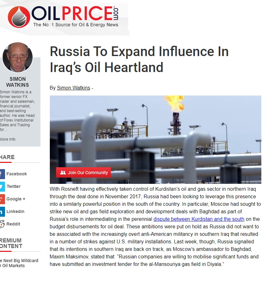 وقال التقریر، إنه مع سیطرة شركة “روسنفت” فعلیاً على قطاع النفط والغاز في إقلیم كردستان العراق، من خلال الصفقة المبرمة في نوفمبر 2017 ،تتطلع روسیا إلى الاستفادة من هذا الوجود في موقع قوي مماثل في جنوب البلاد.