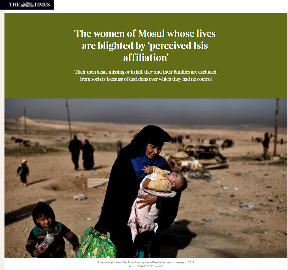 قالت صحيفة التايمز إن نحو 250 ألف عراقي أغلبهم من النساء والأطفال يعانون من “وصمة” انتماء بعض رجال عائلاتهم إلى تنظيم داعش الإرهابي مما جعل مجتمعاتهم تنبذهم بالإضافة إلى تعرضهم لمضايقات أمنية وعدم حصولهم على مساعدات ومعونات من الدولة.