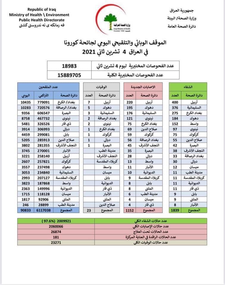 وقالت الوزارة في بيان إن “الكوادر الصحية سجلت في عموم المحافظات العراقية 1152 إصابة جديدة بالفيروس، فيما تماثل 1839 مصاباً إلى الشفاء، وقابل ذلك وفاة 23 مصاباً خلال المدة المذكورة”.