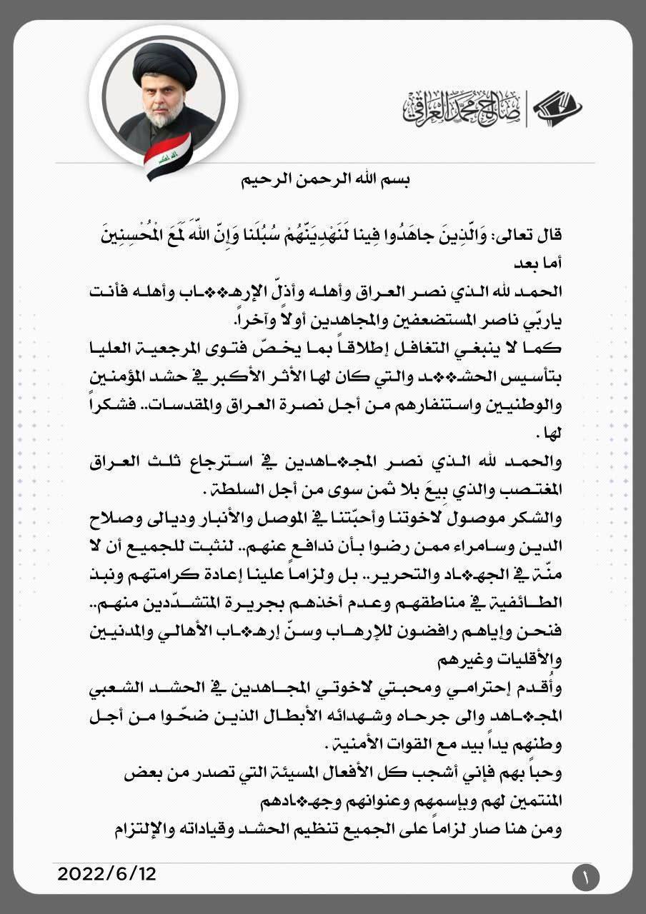 دعا زعيم التيار الصدري، مقتدى الصدر، اليوم الاحد، الى ابعاد الحشد الشعبي عن السياسة والتجارة والخلافات والصراعات السياسية وطالب بتصفيته من المسيئين.