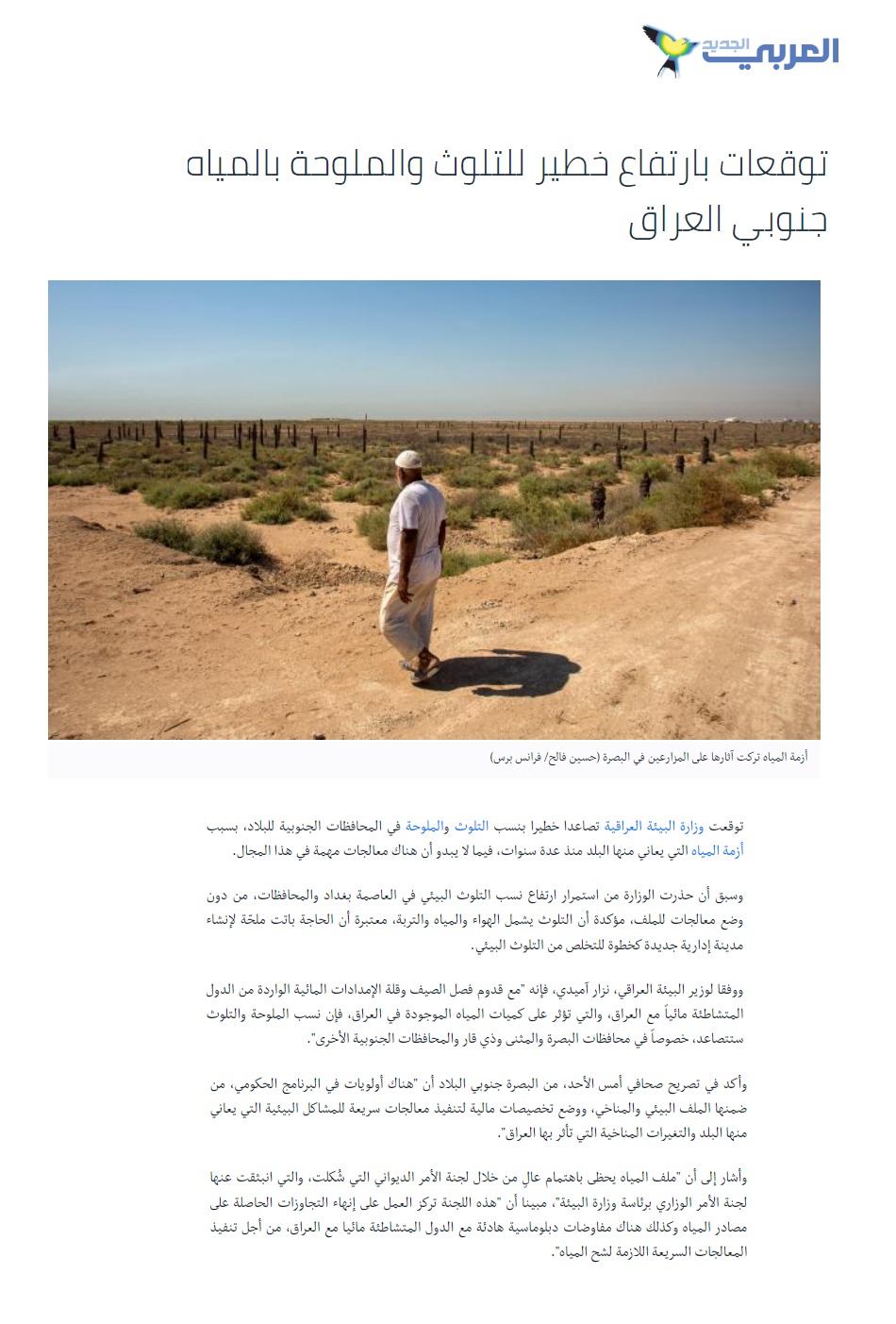 نشرت صحيفة العربي الجديد تقريرا بعنوان “توقعات بارتفاع خطير للتلوث والملوحة بالمياه جنوبي العراق” جاء فيه إن البيانات الحكومية تؤكد أن هناك تصاعدا خطيرا بنسب التلوث والملوحة في المحافظات الجنوبية للبلاد، بسبب أزمة المياه التي يعاني منها البلد منذ عدة سنوات، فيما لا يبدو أن هناك معالجات مهمة في هذا المجال.