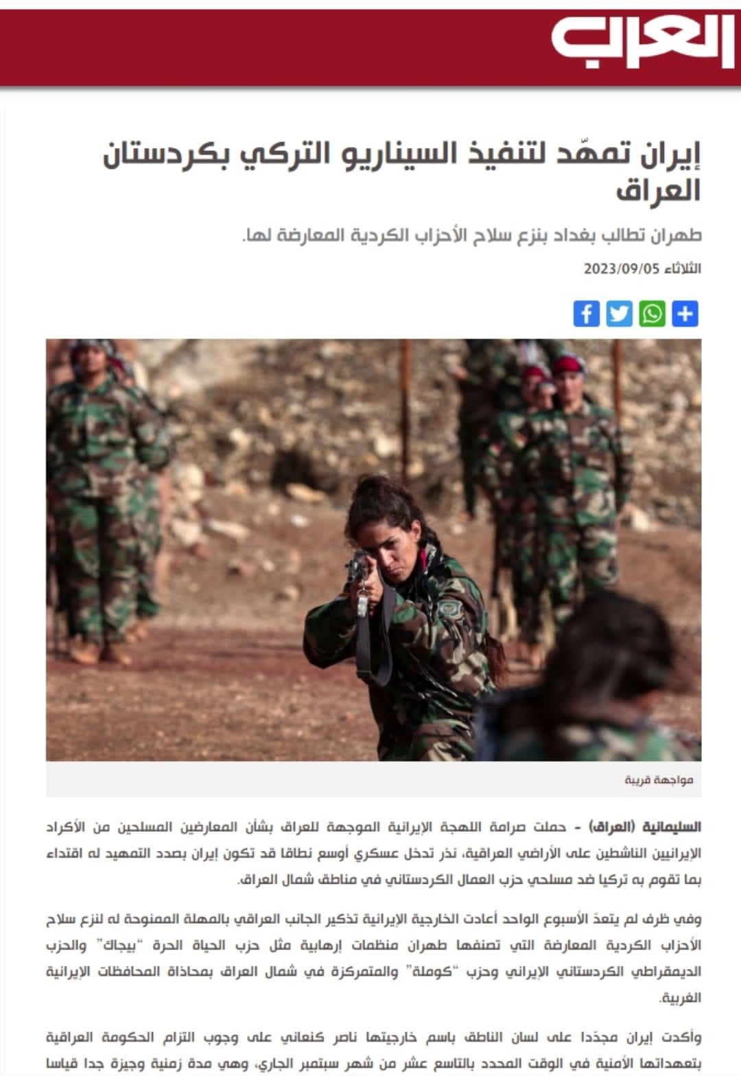 وقالت الصحيفة إنه في ظرف لم يتعدّ الأسبوع الواحد أعادت الخارجية الإيرانية تذكير الجانب العراقي بالمهلة الممنوحة له لنزع سلاح الأحزاب الكردية المعارضة التي تصنفها طهران منظمات إرهابية مثل حزب الحياة الحرة “بيجاك” والحزب الديمقراطي الكردستاني الإيراني وحزب “كوملة” والمتمركزة في شمال العراق بمحاذاة المحافظات الإيرانية الغربية.