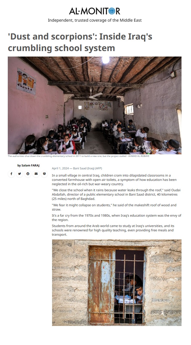 في تقرير تحت عنوان “الغبار والعقارب” داخل النظام المدرسي المتداعي في العراق” قال تقرير لموقع المونيتور إنه في قرية صغيرة في وسط العراق، يتكدس الأطفال في فصول دراسية متداعية في مزرعة تم تحويلها مع مراحيض في الهواء الطلق، وهو أحد أعراض إهمال التعليم في البلد الغني بالنفط ولكن الذي أنهكته الحرب.