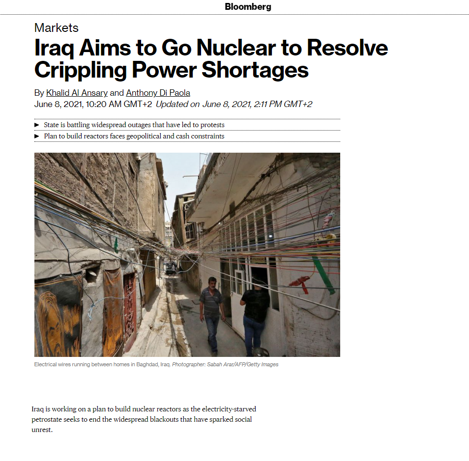 وبحسب بلومبرغ فإن العراق قد يصل إلى إنتاج 22 ألف ميغاواط من الكهرباء في أغسطس وهو أقل من الطلب الافتراضي البالغ 28 ألف ميغاواط في الظروف العادية , وأنه حتى بعد بناء المفاعلات النووية ستكون هناك فجوة بمقدار 10 آلاف ميغاواط في عام 2030 حيث سيصل الطلب المتوقع إلى 42 ألف ميغاواط , مشيرة إلى أن العراق في حاجة إلى ضخ استثمارات كبيرة في قطاع الكهرباء وتوفير الحد الأدنى من المتطلبات الأمنية لتنفيذ مشاريع مع شركات مثل جنرال إلكتريك أو سيمينز المتخصصتين في الطاقة.