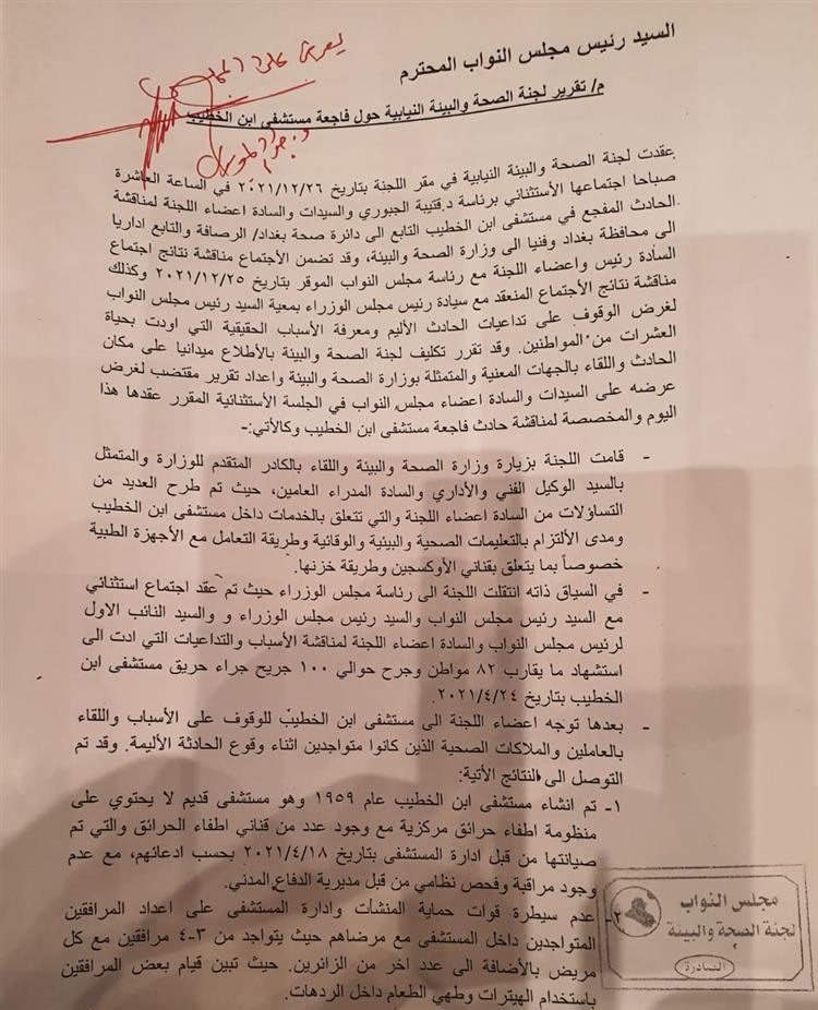 تنشر البغدادية تقرير لجنة الصحة النيابية بشأن اسباب حريق مستشفى ابن الخطيب.