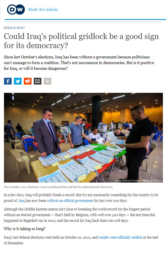 نشرت صحيفة دويتشه فيلا الألمانية تقريرا بعنوان ” هل يمكن أن يكون الجمود السياسي في العراق علامة جيدة على ديمقراطيته؟” قالت فيه إنه في غضون أيام قليلة ، من المحتمل أن يحطم العراق رقما قياسيا لكنه سلبيا في البقاء بلا حكومة رسمية منذ أكثر من 200 يوم.