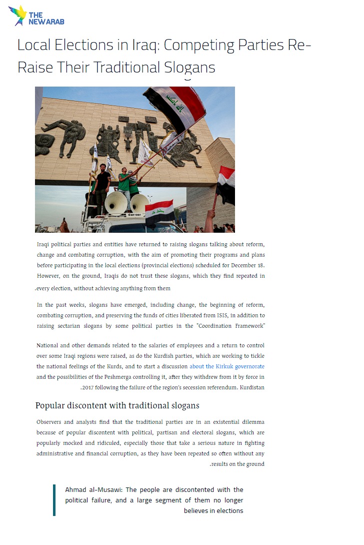 نشرت صحيفة ذا نيو آراب تقريرا بعنوان “الأحزاب المتنافسة في العراق تعيد رفع شعاراتها التقليدية” حيث قالت الصحيفة إن الأحزاب والكيانات السياسية العراقية عادت لرفع شعارات تتحدث عن الإصلاح والتغيير ومكافحة الفساد، بهدف الترويج لبرامجها وخططها قبل المشاركة في الانتخابات المحلية المقررة في كانون الأول المقبل, لكن على أرض الواقع لا يثق العراقيون بهذه الشعارات التي يجدونها تتكرر في كل انتخابات، من دون أن يتحقق منها أي شيء.