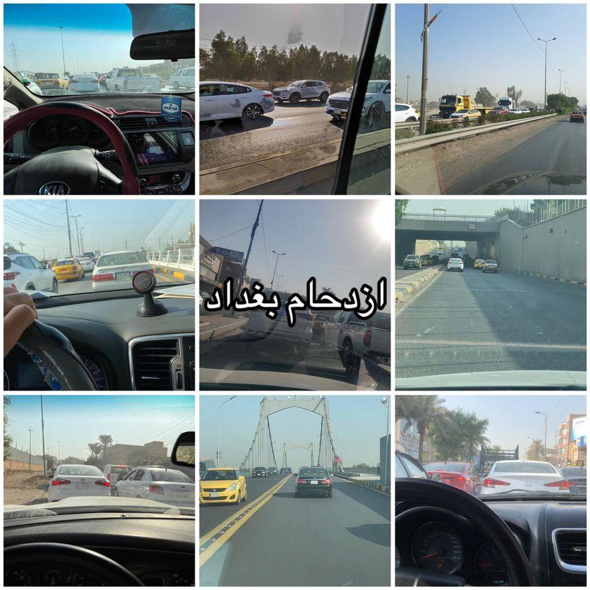 وأظهرت صور حصول زخم مروري عند قوس بغداد باتجاه الدورة، وكما هو الحال في فلكة أبو جعفر المنصور وشارع السفارات.