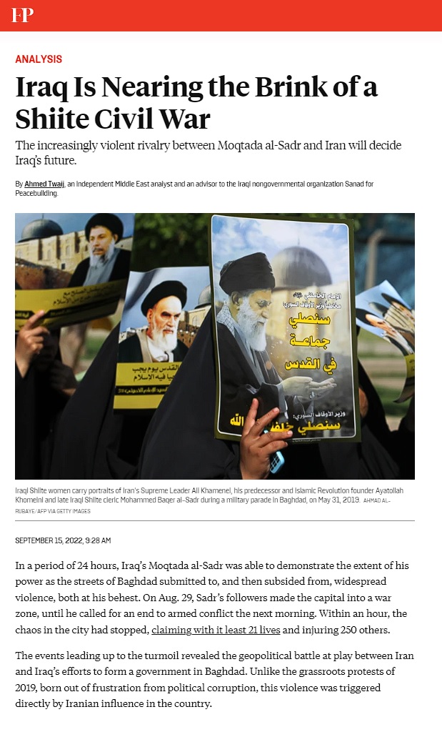 نشرت مجلة فورين بوليسي الأميركية تحليلا بعنوان ” العراق يقترب من شفا حرب أهلية شيعية” قالت فيه إنه على عكس الاحتجاجات الشعبية في عام 2019،… Read More