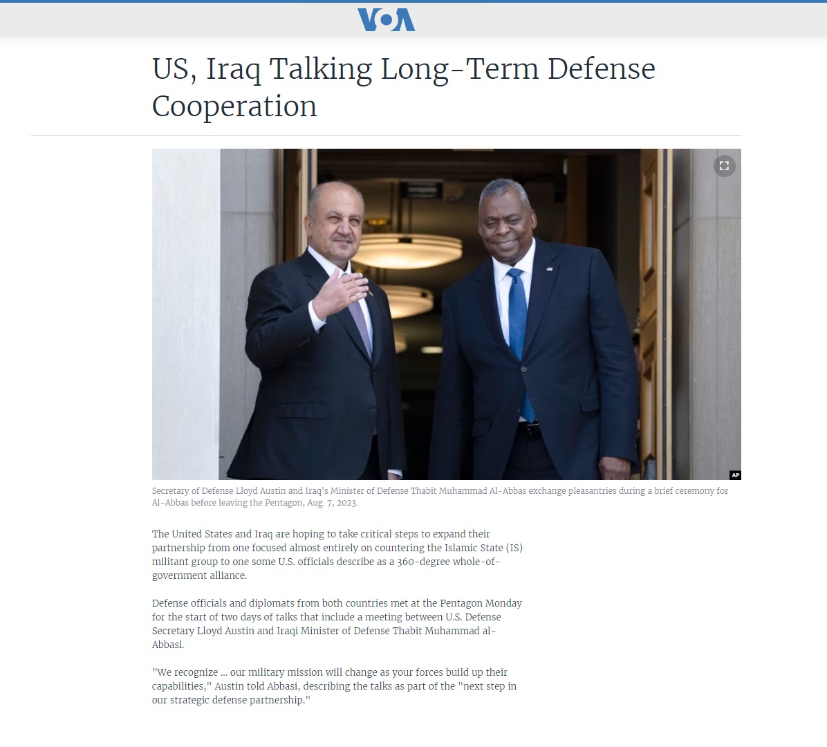 نشر موقع فويس أوف أميركا تقريرا تحت عنوان ” العراق والولايات المتحدة يتفقان على استراتيجية دفاعية طويلة المدى ” جاء فيه إن كلا من الطرفين يأملان باتخاذ خطوات جوهرية مهمة لتوسيع شراكتهما من تلك التي ركزت تركيزا كاملا على مواجهة تنظيم داعش الإرهابي الى شراكة متكاملة