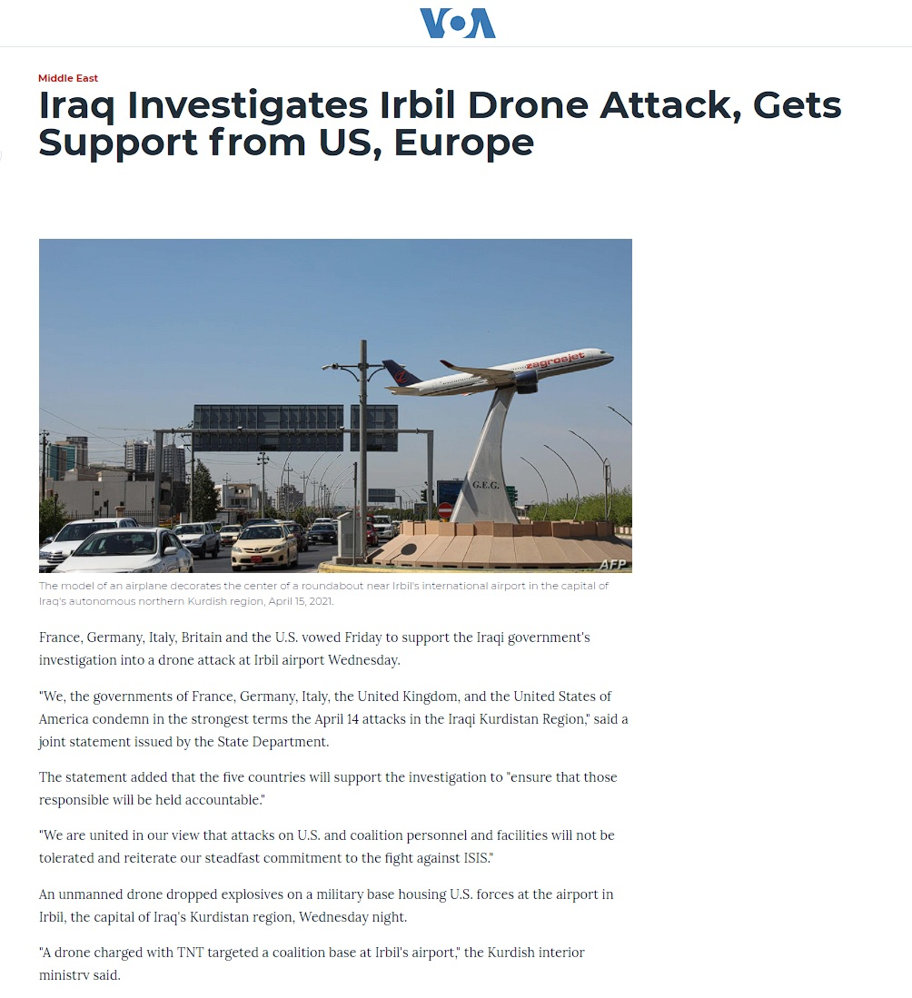 قالت إذاعة صوت أميركا إن الولايات المتحدة وعددا من الدول الأوروبية يتابعون التحقيقات العراقية فيما يخص الهجوم بالطائرات المسيرة على قاعدة أربيل.