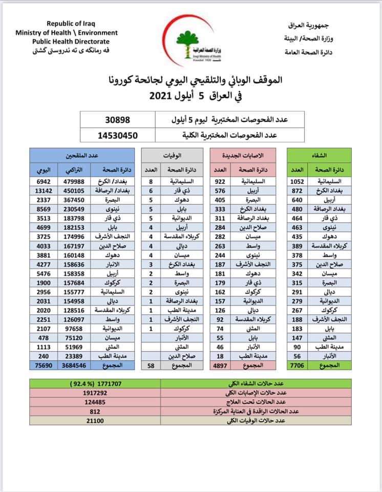 اعلنت وزارة الصحة العراقية، ارتفاع عدد الاصابات والوفيات اليومية بفيروس كورونا في البلاد.