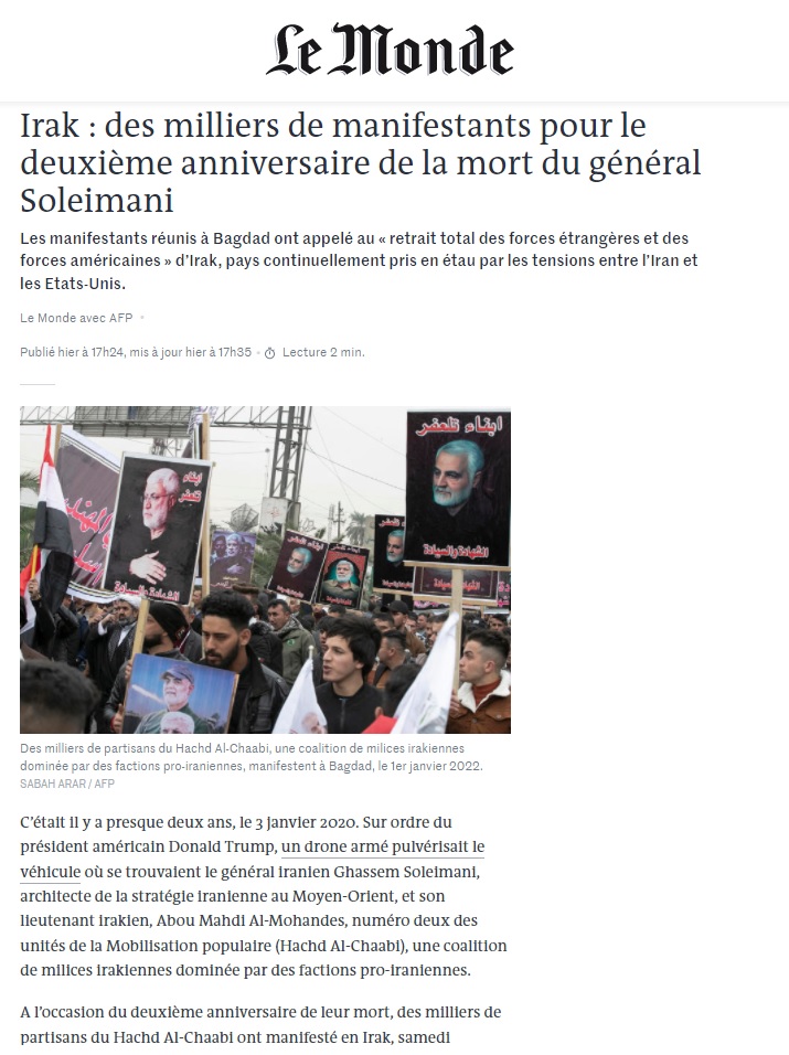 قالت صحيفة لوموند الفرنسية إن التظاهرات التي قادتها الميليشيات والفصائل المسلحة في بغداد مع ذكرى استهداف سليماني بمثابة رسالة من طهران تمر عبر وكلائها بأن أذرعها مازالت هي الطولى ليس فقط في العراق ولكن في المنطقة.