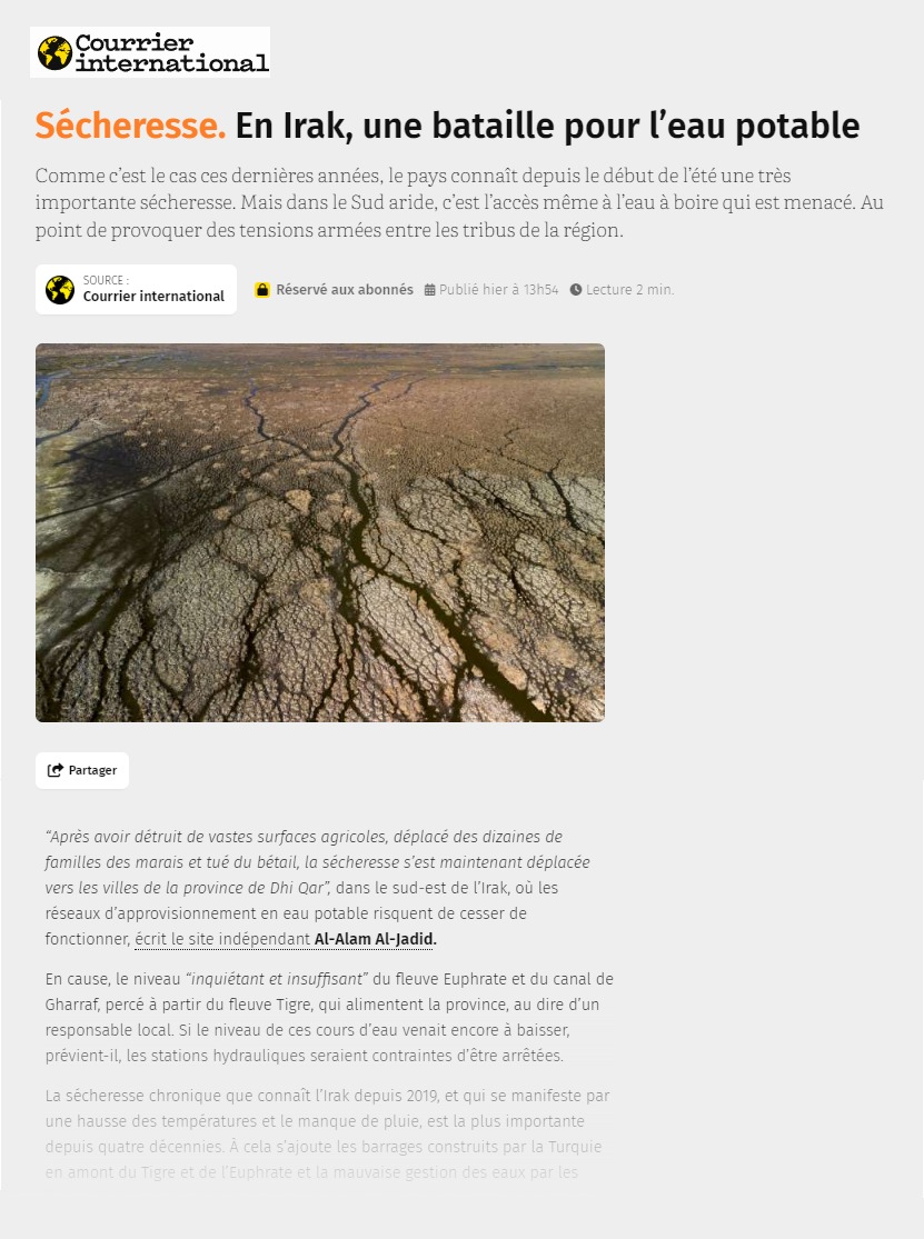 ركزت صحيفة لو كوريير الفرنسية على أزمة مياه الشرب خصوصا في جنوب العراق وذلك في تقرير بعنوان ” معركة من أجل مياه الشرب في العراق” جاء فيه إن العراق يعاني في السنوات الأخيرة من جفاف شديد للغاية وخاصة في الجنوب حيث باتت فإن إمكانية الوصول إلى مياه الشرب مهددة لدرجة إثارة التوترات المسلحة بين عشائر المنطقة.