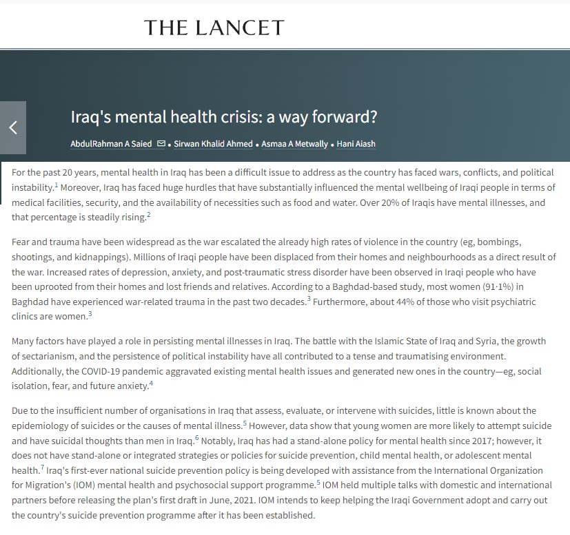 حذرت دراسة لمجلة لانسيت الطبية من معضلة وجودية يعاني منها المجتمع العراقي تتمثل في أمراض الصحة النفسية التي تتفاقم بشكل خطير منذ عام 2003 حتى بات أكثر من 20 بالمائة من العراقيين يعانون من أمراض نفسية.