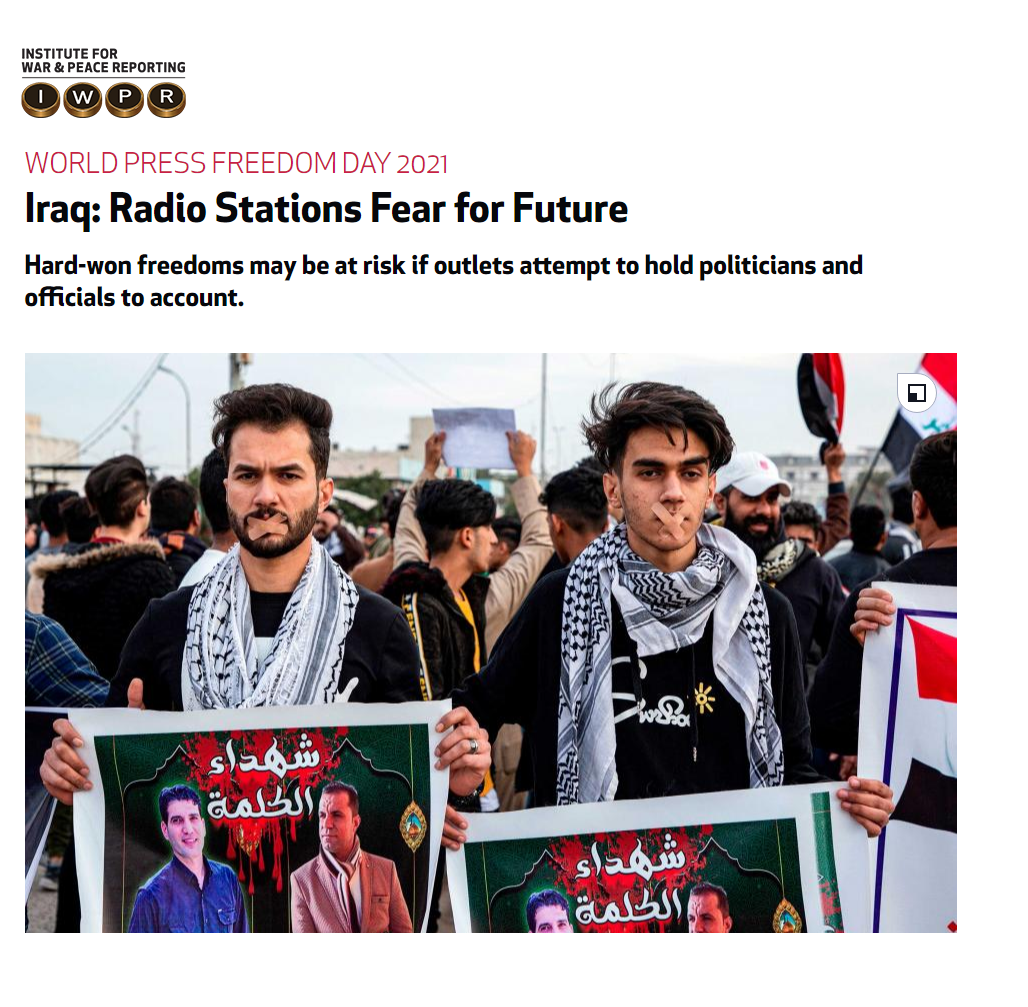قال تقرير لمعهد الحرب والسلام إن حرية الصحافة في العراق تدهورت أكثر مع رد الفعل العنيف ضد الجهود الإعلامية لتغطية موجة الاحتجاجات المناهضة للحكومة التي بدأت في أكتوبر 2019