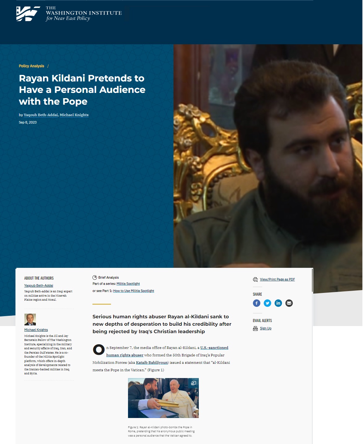 نشر معهد واشنطن تقريرا بعنوان ” الكلداني يحاول اكتساب شرعية من تسويق لقاء مزيف مع البابا فرانسيس” جاء أن ريان الكلداني المخالف الخطير لحقوق الإنسان غرق إلى أعماق جديدة من التزييف لبناء مصداقيته بعد أن رفضته القيادة المسيحية في العراق.
