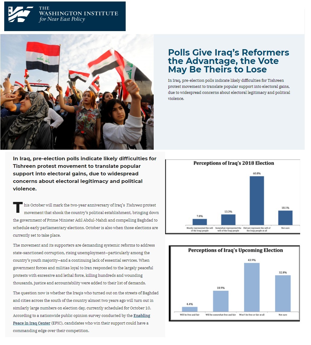 نشر معهد واشنطن للدراسات استطلاعات الرأي قبل الانتخابات المقبلة في العراق أظهرت أن حركة احتجاجات “تشرين” تواجه بعض التحديات التي تتمثل في ترجمة الدعم الشعبي إلى مكاسب انتخابية، وذلك الى القلق المنتشر حول شرعية العملية الانتخابية والعنف السياسي.