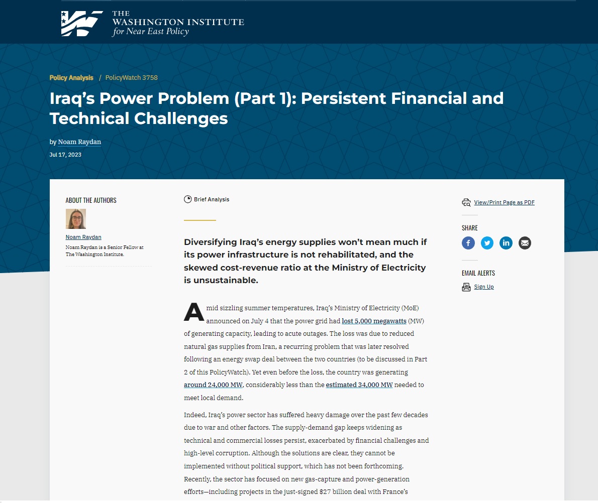 نشر معهد واشنطن دراسة تحليلة بعنوان “مشكلة الطاقة في العراق.. التحديات المالية والتقنية المستمرة” جاء فيه إن قطاع الطاقة في العراق يعاني من أضرار جسيمة على مدى العقود الماضية بسبب الحرب والفساد وعوامل سياسية ما جعل فجوة العرض والطلب تستمر في الاتساع مع استمرار الخسائر المالية والتقنية.