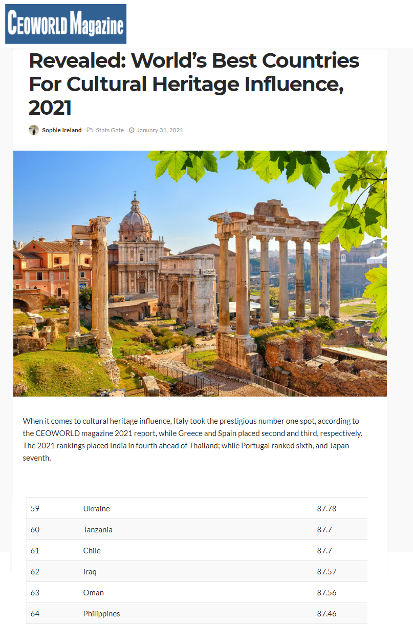 وضعت مجلة “سيو وورلد” المتخصصة في التراث العالمي , العراق في مراتب متأخرة من حيث التأثير الثقافي العالمي حيث حاز على المرتبة 62 عالمياً، والسابعة عربياً، بالرغم مما يمتلكه من آثار وتراث ثقافي زاخر.