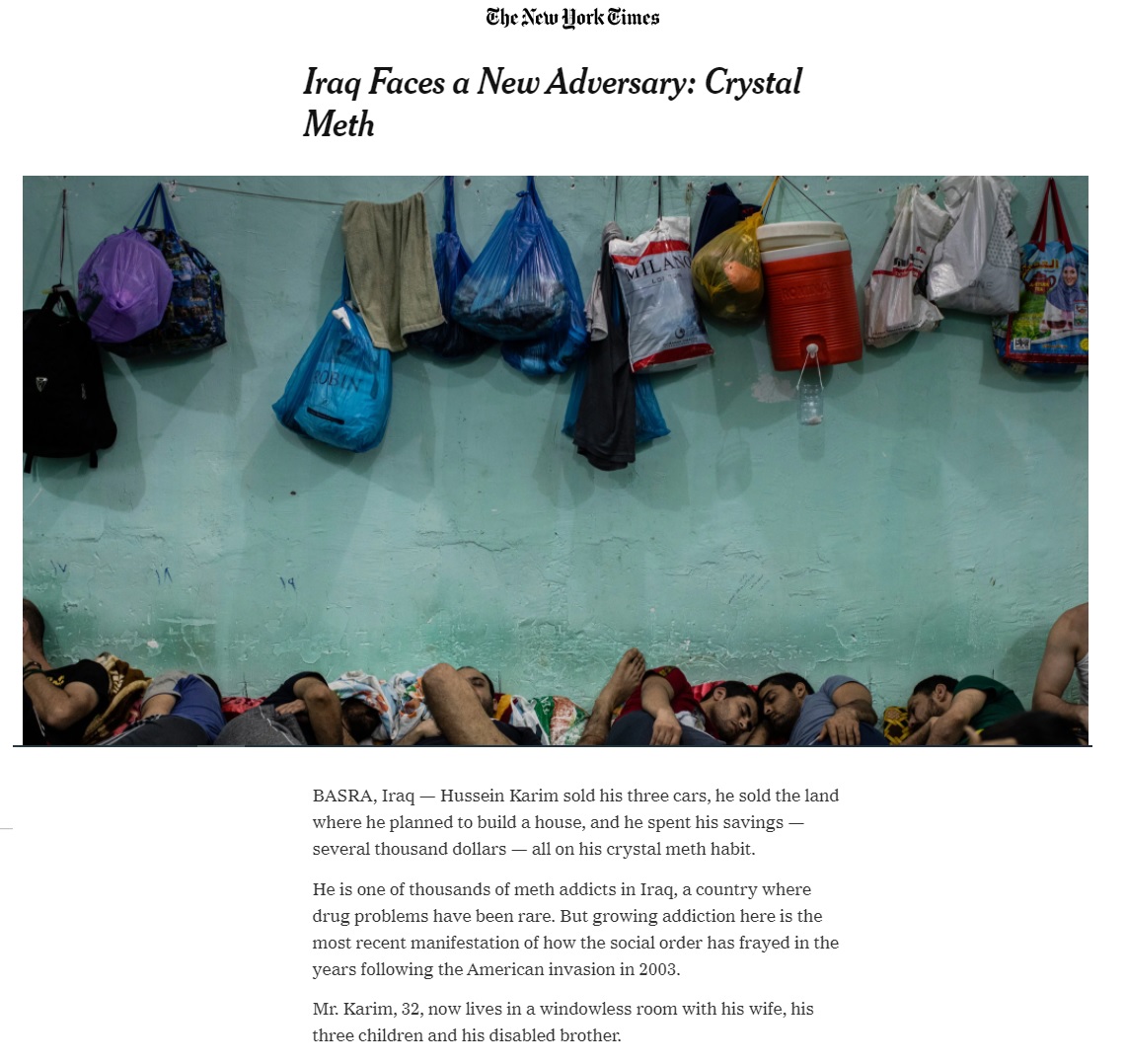 وقالت نيويورك تايمز إن العراق لا يزال يتعامل مع ملف المخدرات من وجهة نظر أمنية بحتة بينما الجهود الأخرى تكاد تكون معدومة مشيرة إلى العراق تحول من دولة كانت تعبر من خلاله المخدرات عبر المنافذ الحدودية من دول الجوار دون رقابة إلى دولة يتعاطى فيها الشباب الكريستال والحشيش