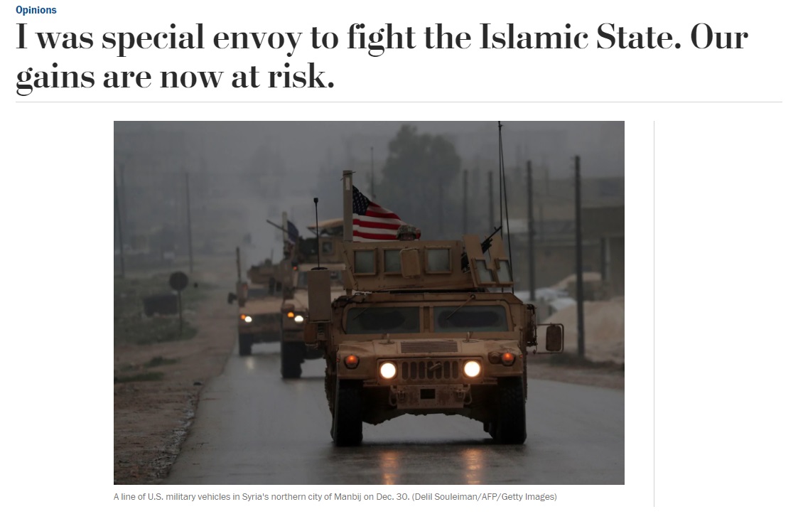 قال المبعوث الأمريكي الأسبق جون آلان صاحب فكرة إنشاء التحالف الدولي ضد داعش , إن إعلان إدارة ترامب هزيمة داعش غير واقعي و سيدمر جهود القضاء على التنظيم الإرهابي مشيرا إلى أن الانسحاب من سوريا سيكون خطأ كبيرا خاصة أن إدارة ترامب لم تطرح البديل .. تصريحات آلان جاءت في مقال له بصحيفة واشنطن بوست وهذا نصه