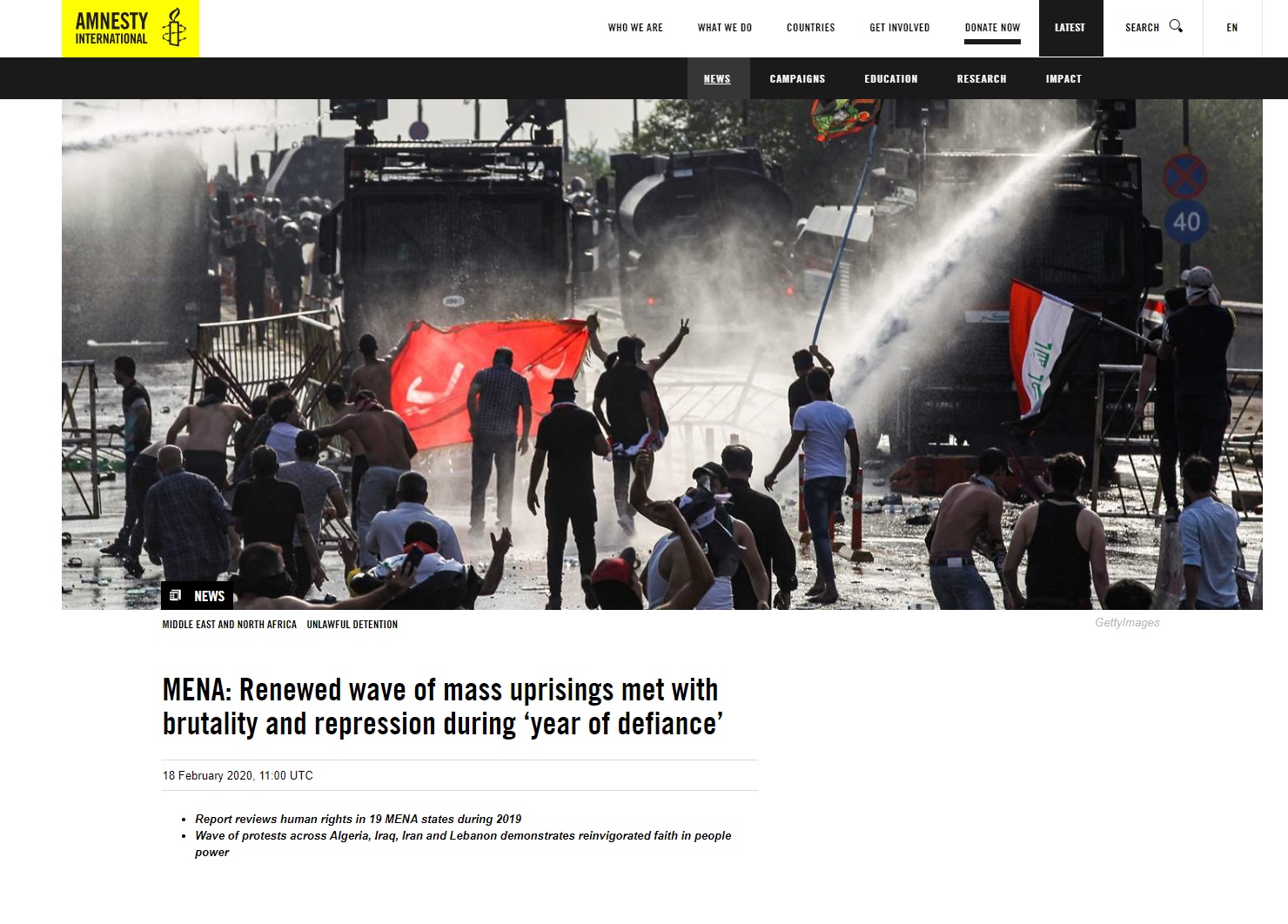 وحملت المنظمة في تقرير لها السلطات العراقية مسؤولية مقتل أكثر من 500 متظاهر وإصابة الآلاف، وفق معطيات تقريرها لحالة حقوق الإنسان في الشرق الأوسط لعام 2019 ، والذي ركزت فيها بجانب أساسي على العراق.