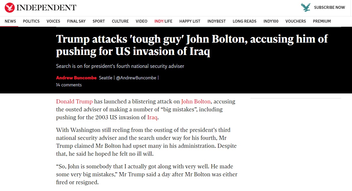 وفي تقرير بعنوان ترامب يهاجم مستشاره للأمن القومي جون بولتون , لفتت الاندبندنت إلى اتهامات ترامب لبولتون بالمساعدة في اتخاذ قرار غزو العراق خلال عمله في إدارة الرئيس الأسبق جورج بوش الابن.