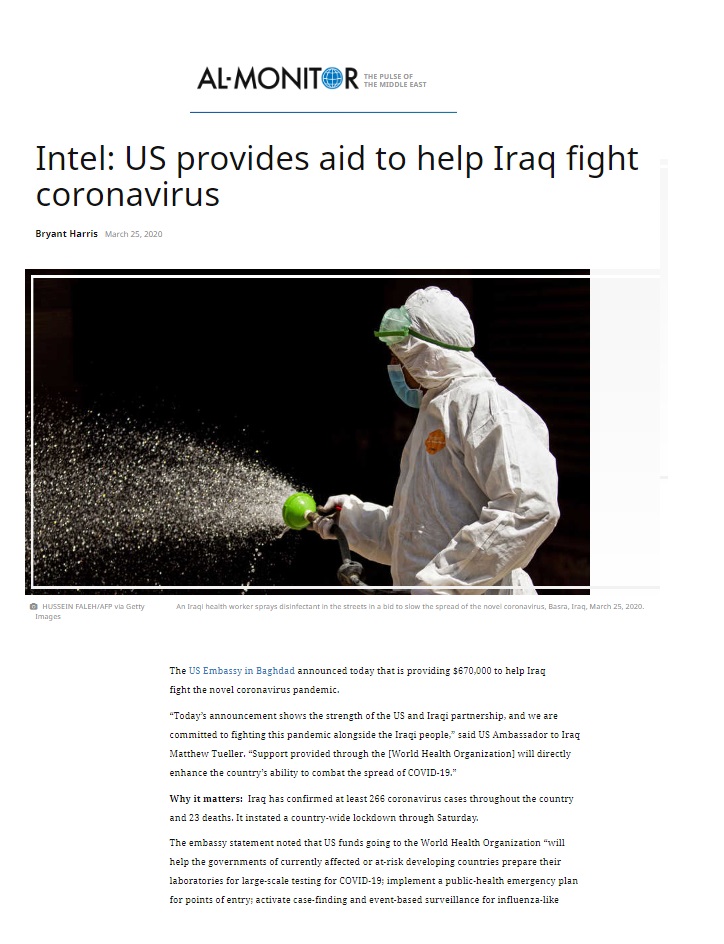 وقالت المونيتور إن الأموال الامريكية التي ستدعم العراق من خلال منظمة الصحة العالمية ستخصص لتنفيذ خطة طوارئ عاجلة للصحة العامة في و تدريب وتجهيز الفرق الطبية للاستجابة السريعة لحالات العدوى من فيروس كورونا
