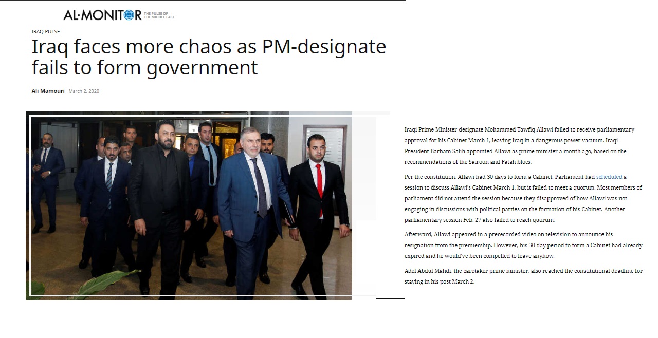 أوردت صحيفة المونيتور تقريرا تساءلت فيه عن إمكانية حل البرلمان العراقي نفسه والاتجاه نحو انتخابات مبكرة في ظل المشهد السياسي الضبابي في أعقاب فشل تمرير حكومة محمد توفيق علاوي