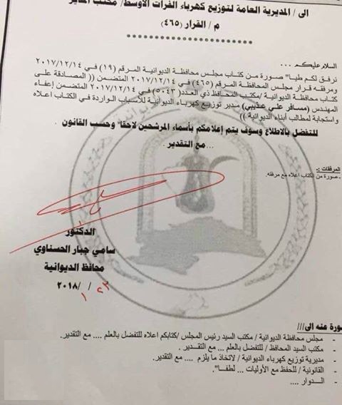 وقال الحسناوي بكتاب رسمي حصلت/البغدادية/على نسخة منه، انه"تم إرسال القرار إلى وزارة الكهرباء والمديرية العامة لتوزيع كهرباء الفرات الأوسط لحسم الموضوع والمصادقة على كتاب الإقالة وفتح باب الترشيح لإدارة توزيع كهرباء الديوانية".
