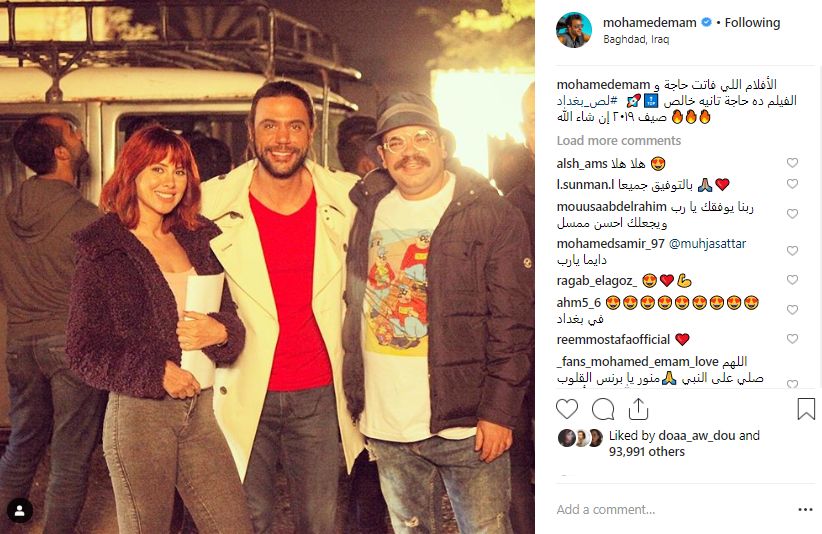ظهر محمد إمام في الصورة برفقة ياسمين رئيس ومحمد عبد الرحمن وعلق قائلًا "الأفلام اللي فاتت حاجة و الفيلم ده حاجة تانيه خالص.. لص بغداد.. صيف 2019.