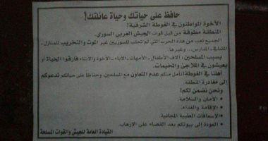 ألقت مروحيات الجيش السورى، منشورات للمدنيين فى غوطة دمشق الشرقية، تطلب منهم تسليم أنفسهم للحفاظ على حياتهم، وعدم التعامل مع المسلّحين.