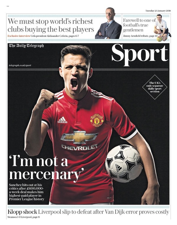 وخرجت صحيفة "تيليجراف" بعنوان" لست جشعا"، وذلك ضمن عرضها لرد سانشيز على من اتهمه بإتمام الصفقة من أجل المال فقط، بعدما أصبح أعلى اللاعبين أجرا في الدوري الإنجليزي الممتاز.