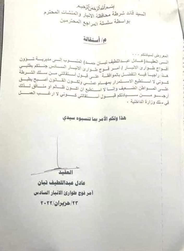 وكان العقيد عادل تبان امر فوج طوارئ الانبار قد اقدم على تقديم استقالته من منصبه بعد تعرضه للضرب والاعتداء من مثنى الحلبوسي شقيق محمد الحلبوسي، اثناء تطبيقه الواجب ومنعه بالسير عكس السير.