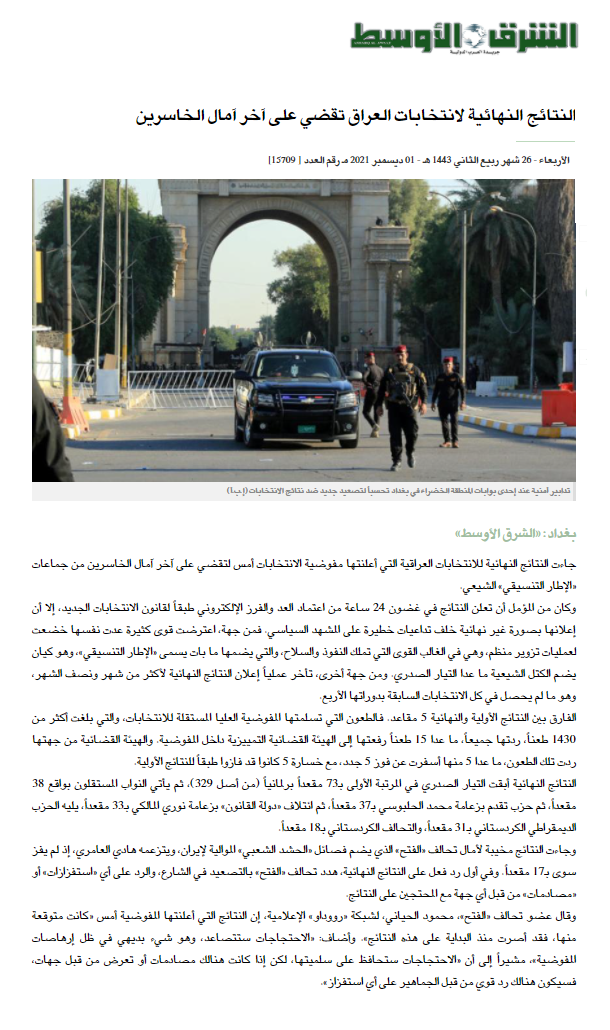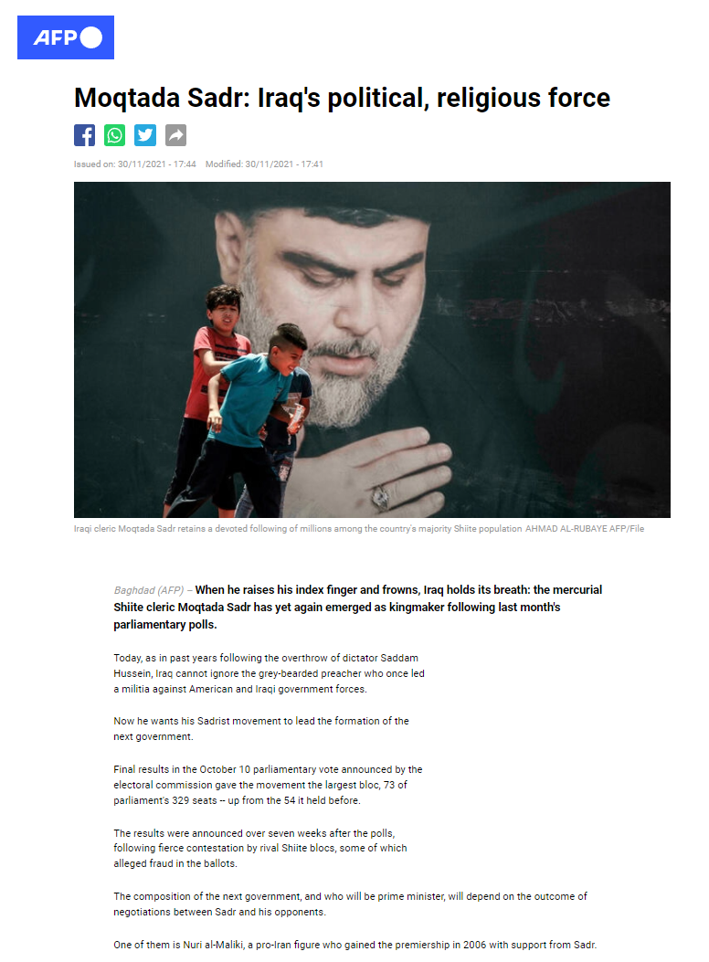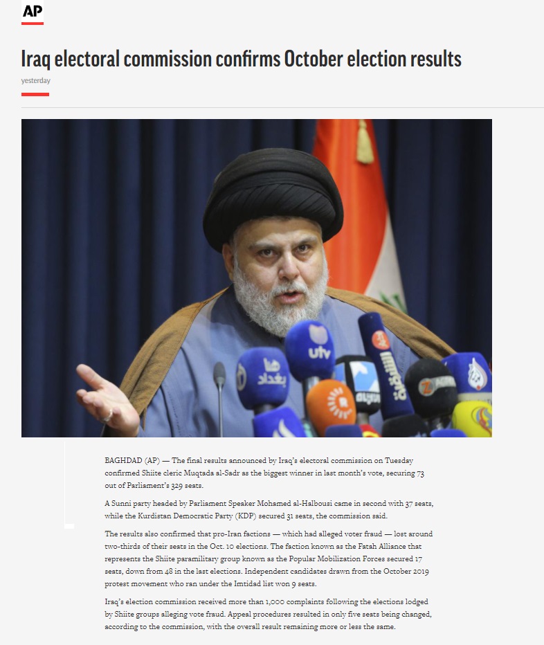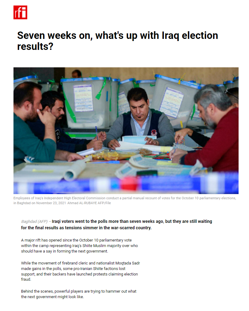 وقال محللون لفرانس برس إن المقلق هو أن القوى الموالية لإيران تحاول الترويج لفكرة أن كل ما يحصل الآن هو مؤامرة لإحداث فتنة داخل البيت الشيعي وهو خطاب مقلق يحمل عدم اعتراف بنتائج الانتخابات ويدعو للعنف ضد بقية المكونات السياسية حيث يقود هذا السيناريو إلى حملة قاسية للتشكيك بالحكومة المقبلة ووضع العقبات أمامها من القوى المستبعدة.