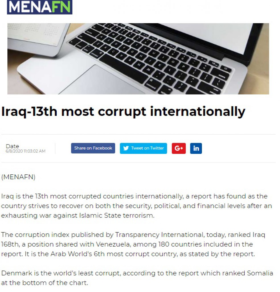 قال تقرير لمعهد الشرق الأوسط وشمال أفريقيا للدراسات إن العراق هو البلد الثالث عشر الأكثر فساداً على الصعيد الدولي وفق مؤشر الفساد الذي نشرته منظمة الشفافية الدولية