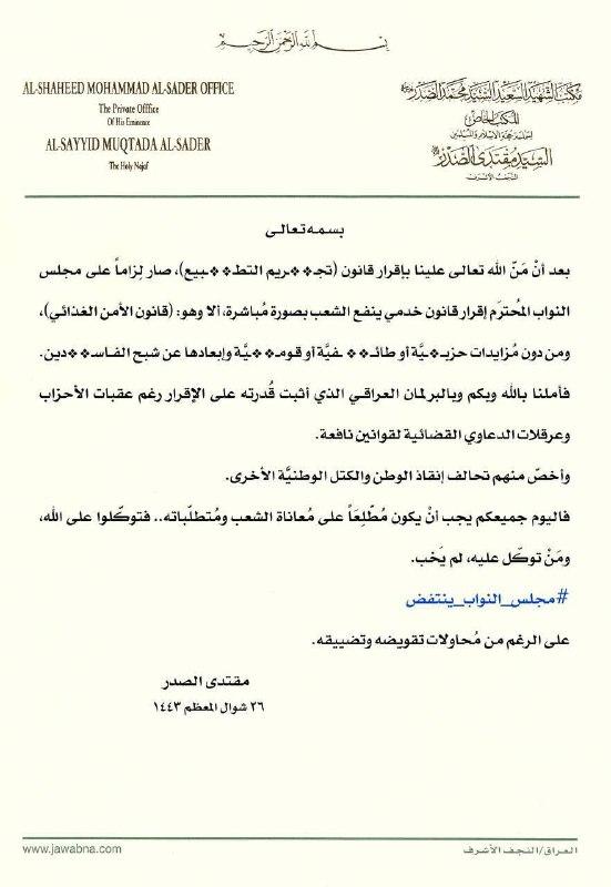 وفي خطابه المقتضب، الذي امتد لثلاث دقائق، اتهم الصدر “المنتمين للثلث المعطل” بأنهم “لا شيء بدون السلطة”، وتساءل “هل وصلت الوقاحة إلى تعطيل القوانين التي تنفع الشعب؟”. في إشارة لعرقلة التصويت على قانون يحمل اسم “قانون الأمن الغذائي” العراقي.