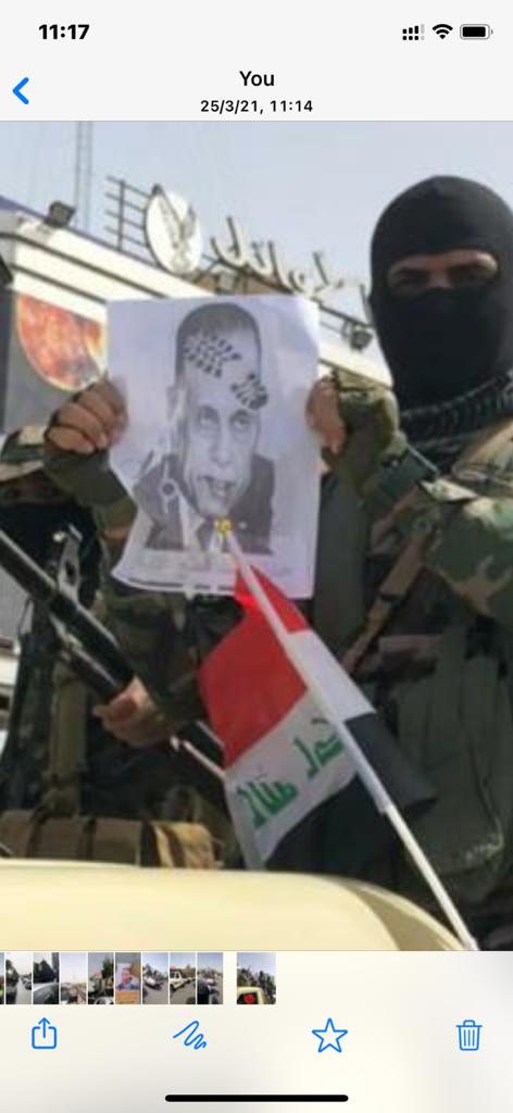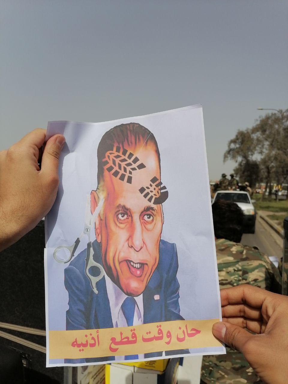 كما حمل المسلحون صور “الكاظمي” متضمنة عبارات ورسومات مهينة، مثل “حان وقت قطع أذنيه”، وأخرى كتب عليها “أيها السيء سنقطع يدك بمجرد المساس بالمقاومة”.