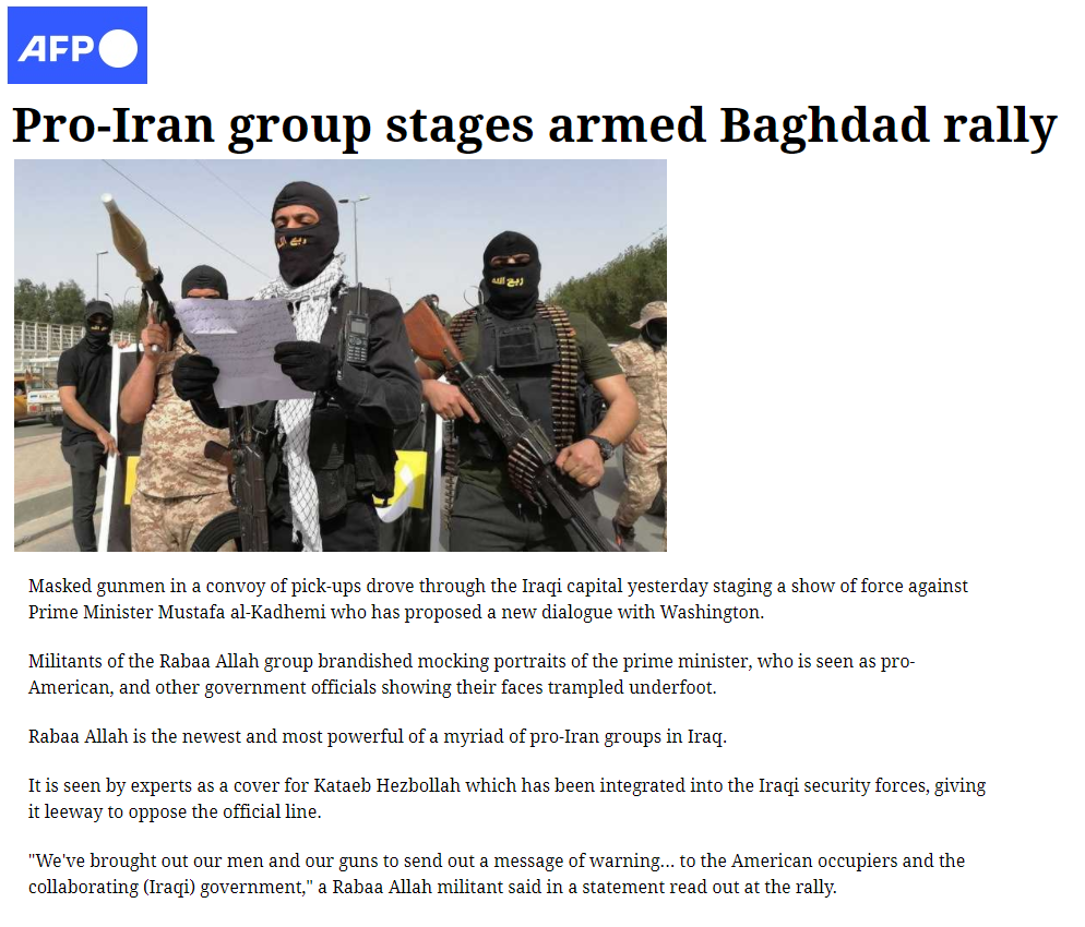 قالت وكالة فرانس برس إن ميليشيات ربع الله نجحت في استعراض قوتها من خلال نشر ميليشياتها في شوارع بغداد وسط صدمة من الحكومة العراقية التي قالت إنها تفاجأت بنزول سيارات مدججة بعناصر تحمل السلاح إلى شوارع العاصمة حاملين صورة رئيس الوزراء مصطفى الكاظمي وقد طبعوا فوقها رسم حذاء وهددوا بقطع أذينه. ونقلت فرنس برس عن شهود قولهم إن القوات العراقية والأجهزة الأمنية لم تتدخل لمنع مواكب الاستعراض العسكري المسلح تجنبا للاحتكاك معها وإثارة فوضى أمنية , بينما تكابد الحكومة لإعادة الاستقرار لبلد تحيط به مخاطر الإرهاب من كل جهة بعد سنوات من حرب على تنظيم داعش. وأضافت الوكالة الفرنسية أن ميليشيا “ربع الله” تذرعت بالخلاف بين الكتل النيابية والأحزاب حول الموازنة لتهدد وتحذر النواب والحكومة من المماطلة في إقرارها , لكن هدفها الأساسي هو استعراض قوتها قبل الانتخابات. ولفتت فرانس برس إلى أن خبراء يعدون حركة ‘ربع الله’ مجرد واجهة لكتائب حزب الله، أحد فصائل الحشد الشعبي المنضوي في القوات الأمنية لكن الاسم الوهمي يسمح لها بانتقاد السلطات مع تفادي الرد , مشيرة إلى أن الاستعراض جاء بعد ساعات من إعلان الحكومة العراقية أن بغداد دعت رسميا واشنطن إلى “حوار استراتيجي” جديد في ظلّ إدارة الرئيس الجديد جو بايدن .