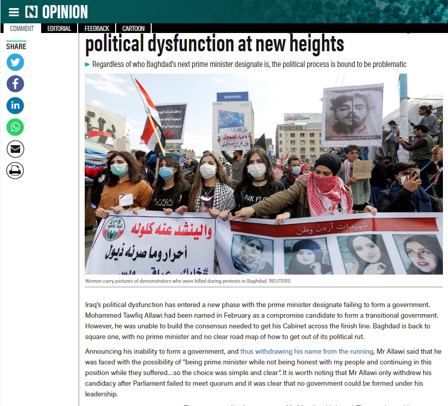 وقالت الصحيفة في تقرير إن العراق عاد إلى المربع الأول ، مع عدم وجود رئيس وزراء ولا خريطة طريق واضحة لكيفية الخروج من الأزمة السياسية ، حيث تؤدي الطبيعة غير المسؤولة لهذا النظام إلى ترك العراقيين يعانون في الشارع بينما يجتمع اللاعبون السياسيون خلف أبواب مغلقة للتنافس على المصالح والمناصب الحكومية وبالتالي بدء دورة جديدة في البحث عن مرشح ستصبح عبثية إذا لم يحدث تغيير حقيق للنظام السياسي بأكلمه بعدما عجز بوضوح طيلة الأعوام السبعة عشرة الماضية في خدمة العراقيين